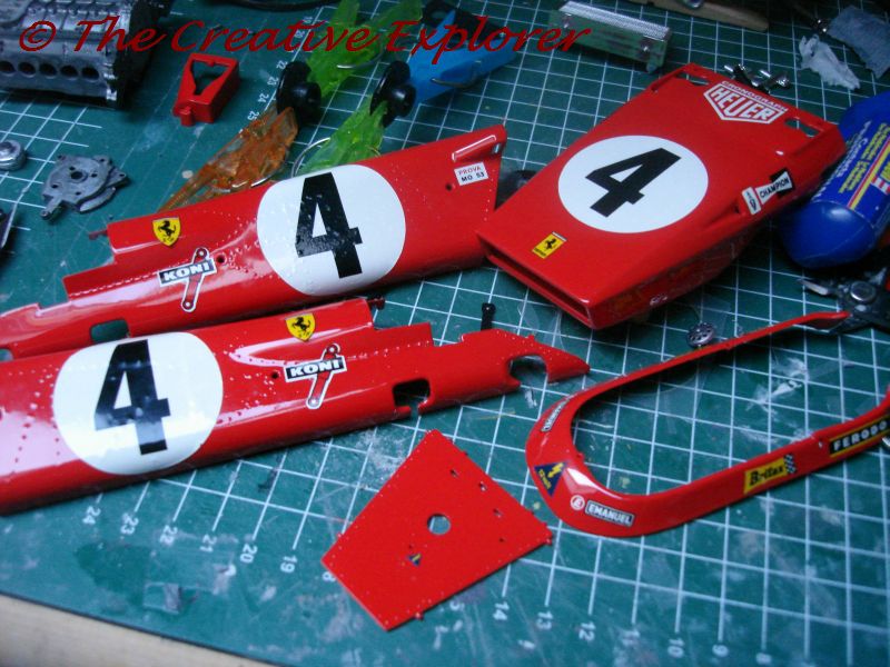 And a jump to the bodypanels. I airbrushed them with Scuderia Red and then 2K glossed them. After it dried, I applied the dry-transfers. Which was a living nightmare, the dry-transfer bit wasn’t working no more, so I had to find an alternative to get them on.